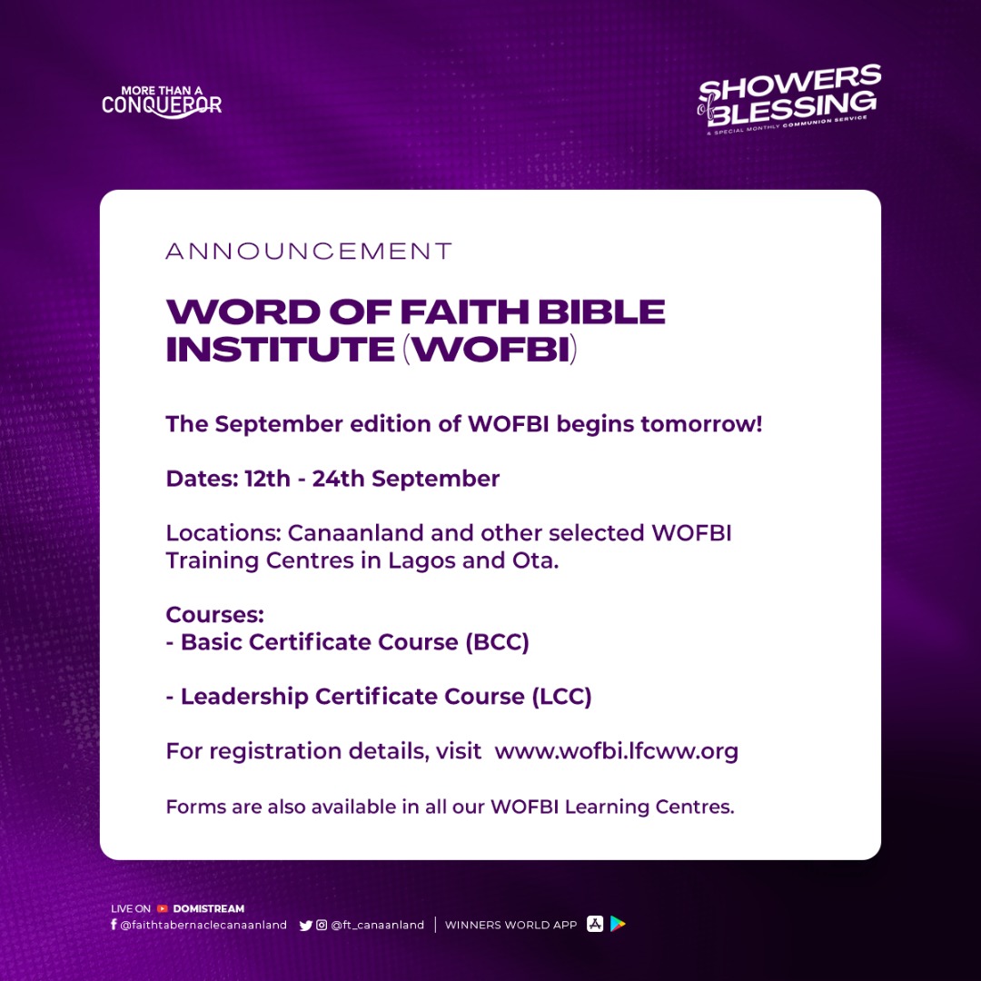 The Word Of Faith Bible Institute [Wofbi] Is A Ministry/Leadership Training Centre, Which Serves As The Training Arm Of The Living Faith Church Worldwide.